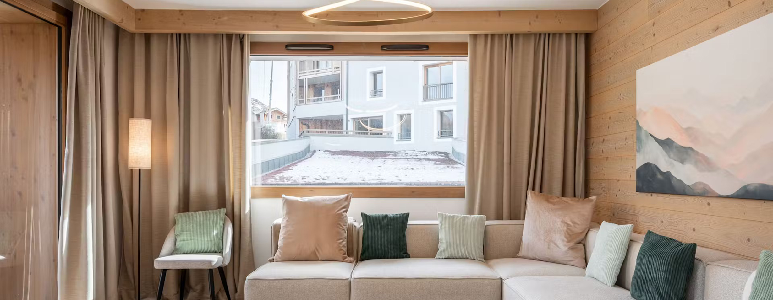 Pour ce projet en station, l'objectif était clair : créer un refuge lumineux et chaleureux. L'appartement joue sur des textures douces — fausse fourrure, feutre et bois clair — pour un effet cocon irrésistible.
