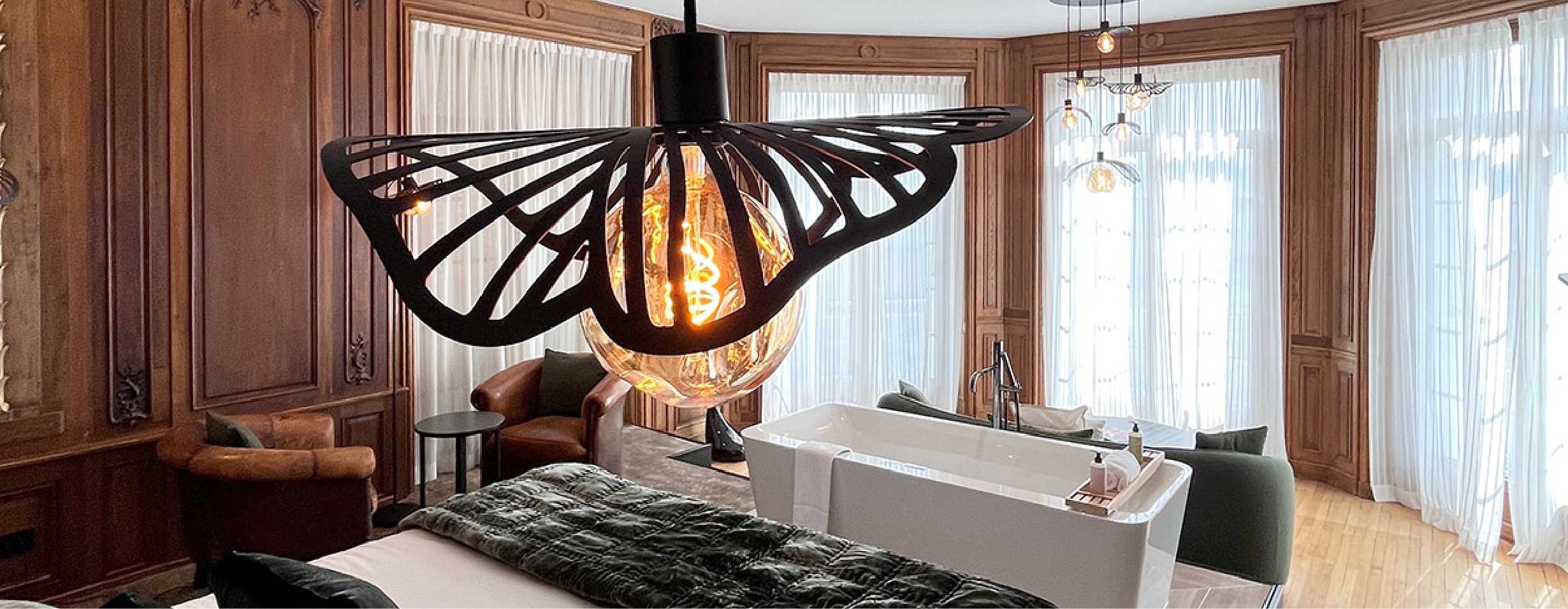 Le choix de décliner un même modèle sous différentes formes crée une harmonie lumineuse qui valorise les matériaux nobles et les volumes de la suite, sans jamais les dominer.