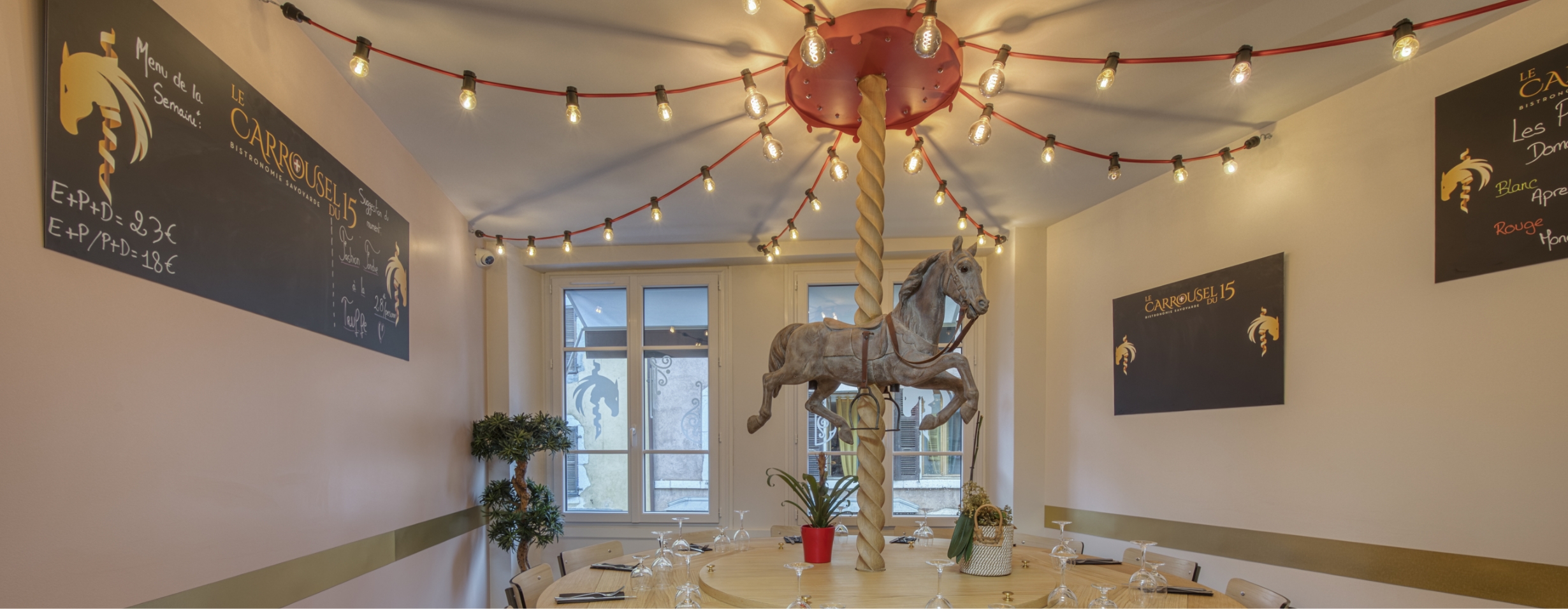Situé au 15 Faubourg des Balmettes, à Annecy, le restaurant Le Carrousel du 15 rend un hommage vibrant au Carrousel Dufaux, emblème local de tradition et de magie enfantine. Pour incarner cette ambiance chaleureuse et nostalgique, l’architecte Olivier Tourel a imaginé un luminaire exceptionnel, conçu à partir d’un véritable cheval de manège en bois, patiemment chiné.